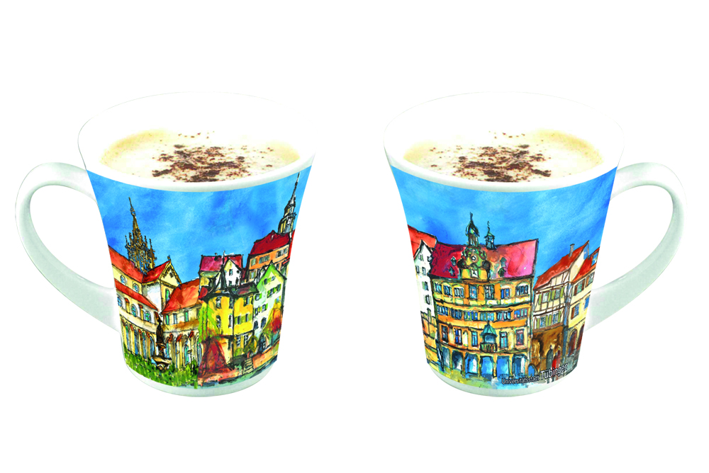 Viele weitere Motive und Produkte folgten, wie der Knirps, zwei Stadttaschen, ein Seidentuch und die Aquarell-Porzellan-Tasse mit Vollflächendekor von Henkel zu Henkel. Aus hochwertigem Porzellan von der Porzellan-Manufaktur in Weiden.