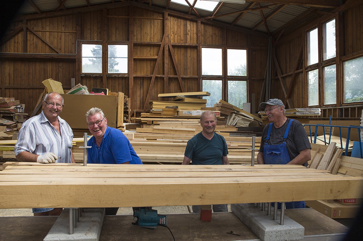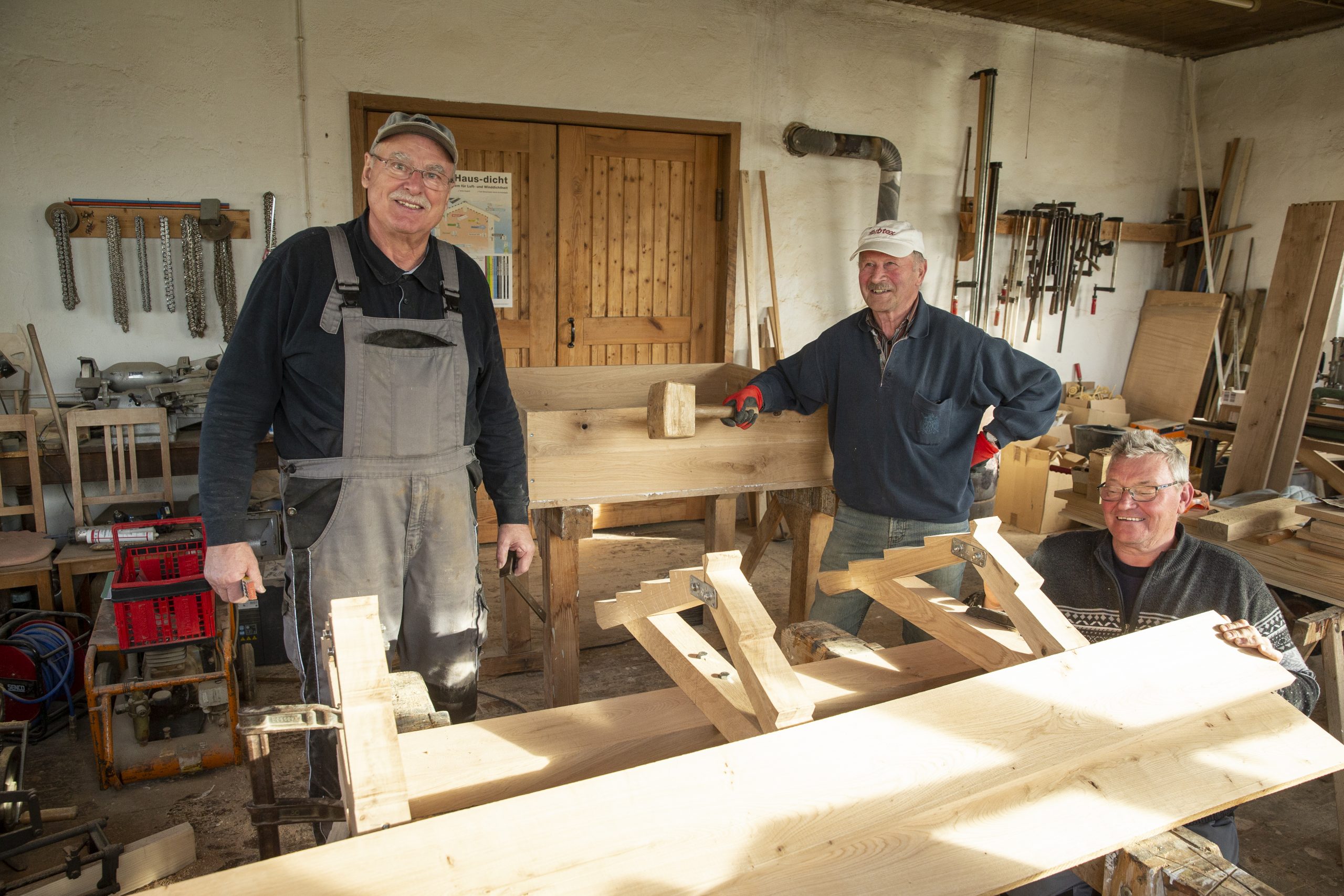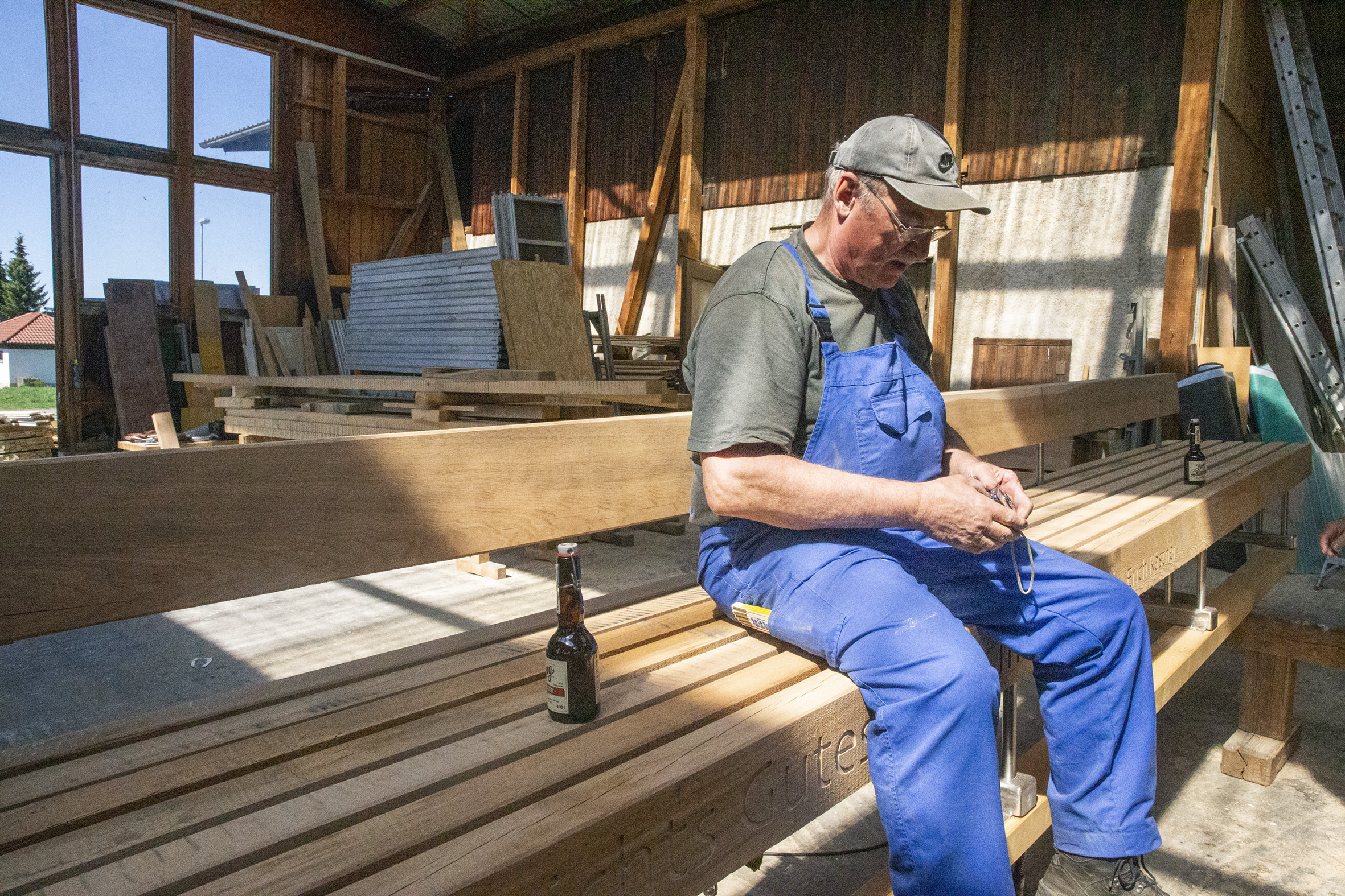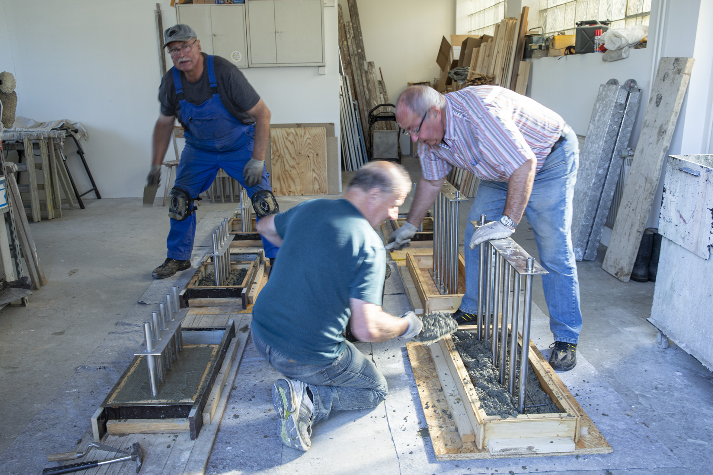 Um dies zu erreichen hat Herbert Bader jahrelang seine Mannen dazu motiviert, sich wöchentlich in Stefan Ulmers Werkstatt (Zimmergeschäft Ulmer in der Öschinger Straße) einzufinden und die Bänkla und Bienenhäuser zu bauen. Das ging los beim rohen Eichendiel, das zurechtgesägt und besäumt werden musste, um die Einzelteile zu erhalten. Schließlich wurde alles gründlich und genau zusammengebaut und grundsolide montiert. Die Bänke stehen auf einem absolut witterungsbeständigen Edelstahl-Gestell, auf das die Eichenbohlen aus dem heimischen Wald aufgesetzt werden. Das Edelstahlgestell wird von Kapo Herbert Bader selbst zuhause zusammengeschweißt und professionell bearbeitet, da er über die Befähigung und Ausstattung zum Edelstahlschweißen und der weiteren Bearbeitung verfügt. Das Gestell fußt in Bodenplatten aus individuell für jede Bank gegossenen Betonfüßen. Herbert Bader hat in den Jahren seit dem Start der Bänklesgruppe stets rechtzeitig und mit großer Umsicht das gesamte erforderliche Material besorgt und anschließend genaustens darauf geachtet, dass das klare charakteristische Design erhalten und insbesondere die hohe Qualität aller Einzelteile und des Zusammenbaus gewährleistet bleiben.