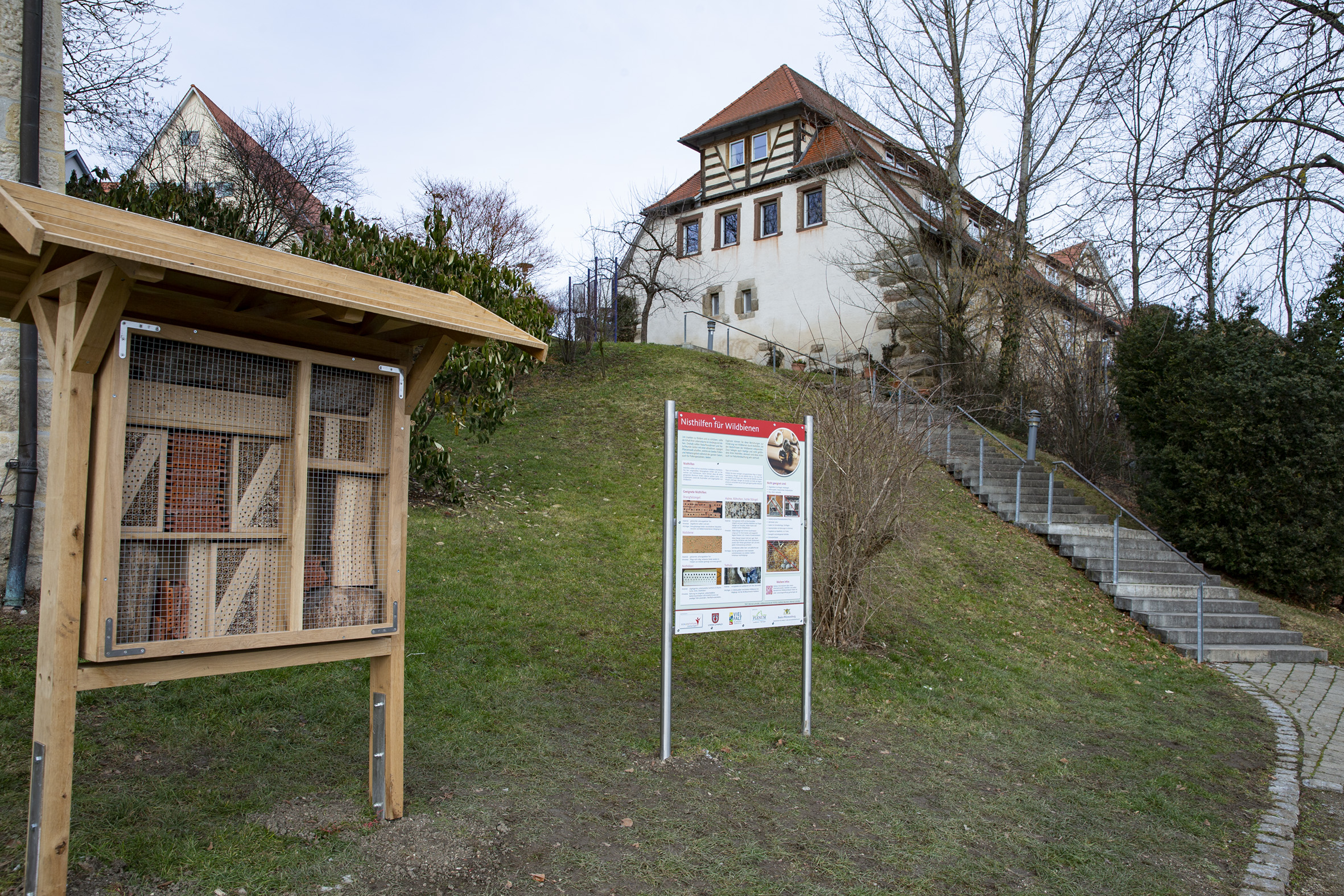 Auch bei den Wildbienenhäusern und den zugehörigen Informationstafeln herrscht ein Materialmix aus Eichenholz und Edelstahl vor. Die eigentlichen Körper der Wildbienenhäuser sind aus Eiche. Sie werden durch edelstählerne Beschläge und Schrauben zusammengehalten und stehen ihrerseits auf Edelstahlfüßen. Auch hier kommt es auf Materialkenntnis und Genauigkeit an, um die hohe Beständigkeit und Qualität der Wildbienenhäuser sicher zu stellen. Herbert Bader hat dabei niemals irgendwelche Abstriche zugelassen.