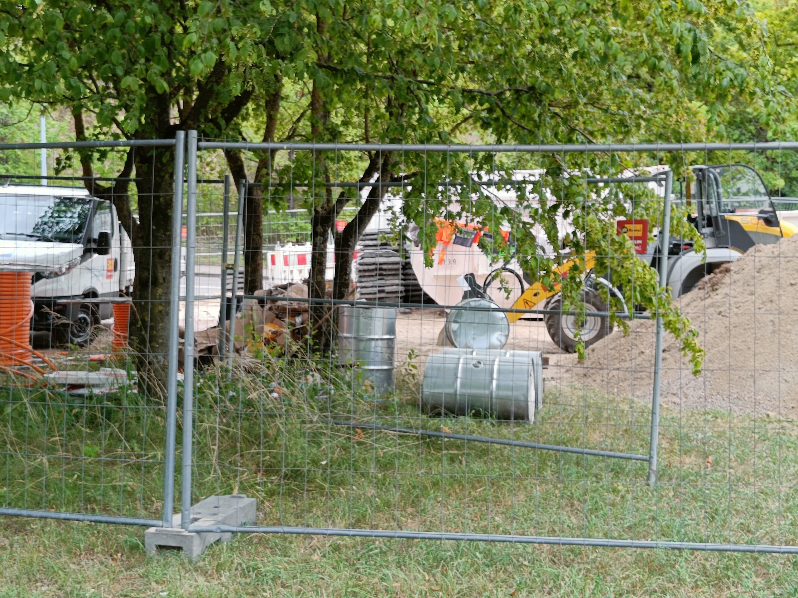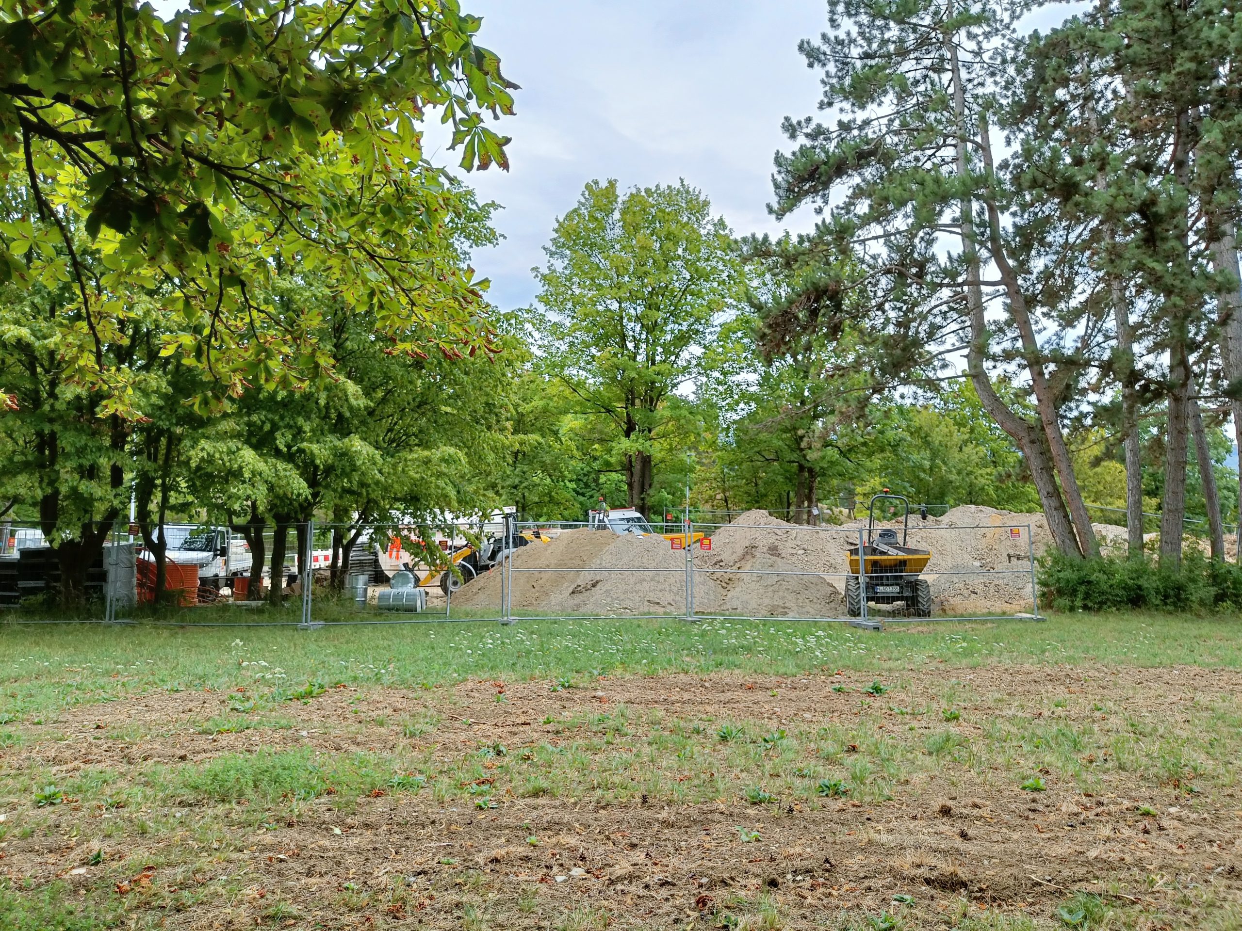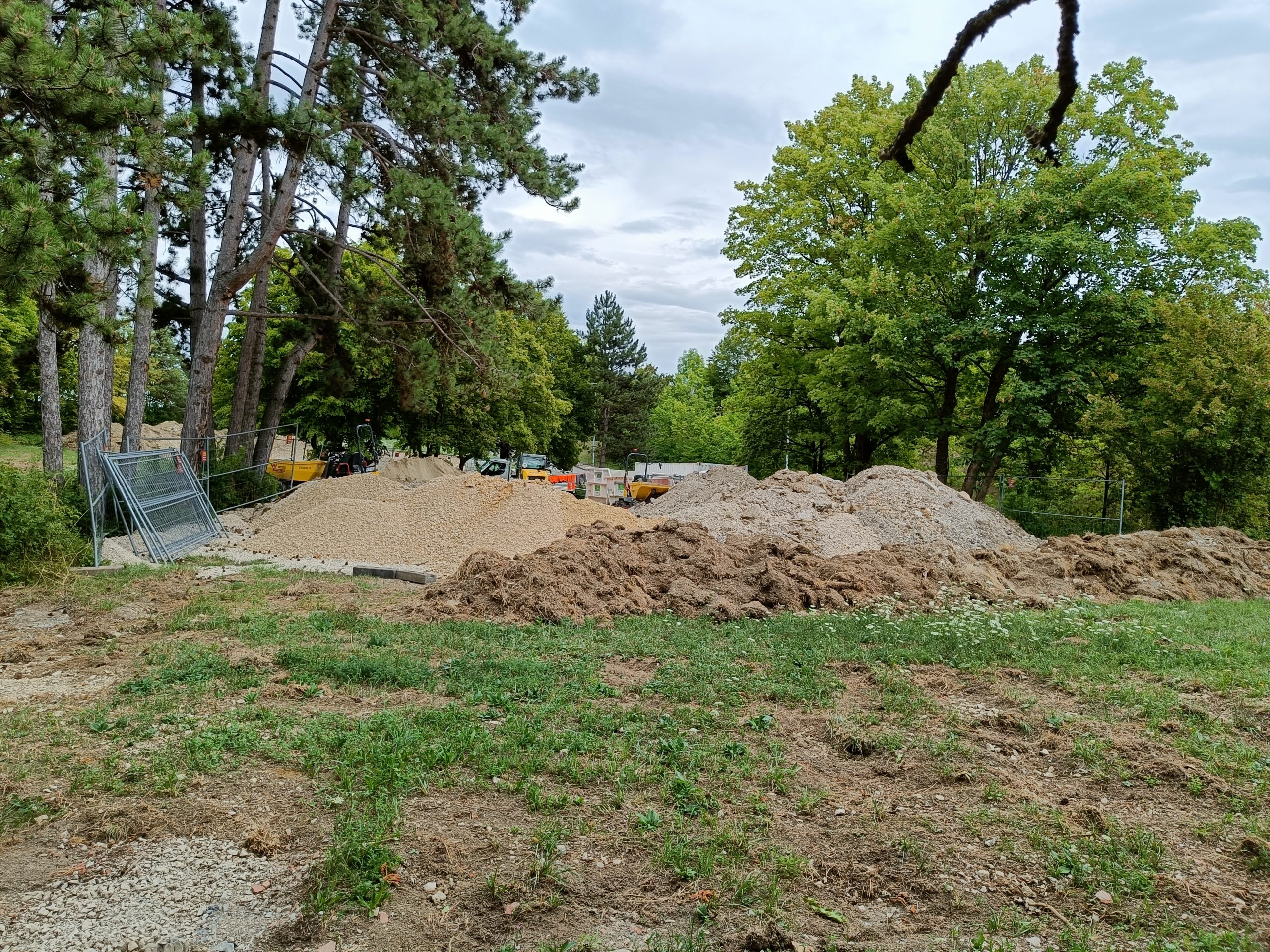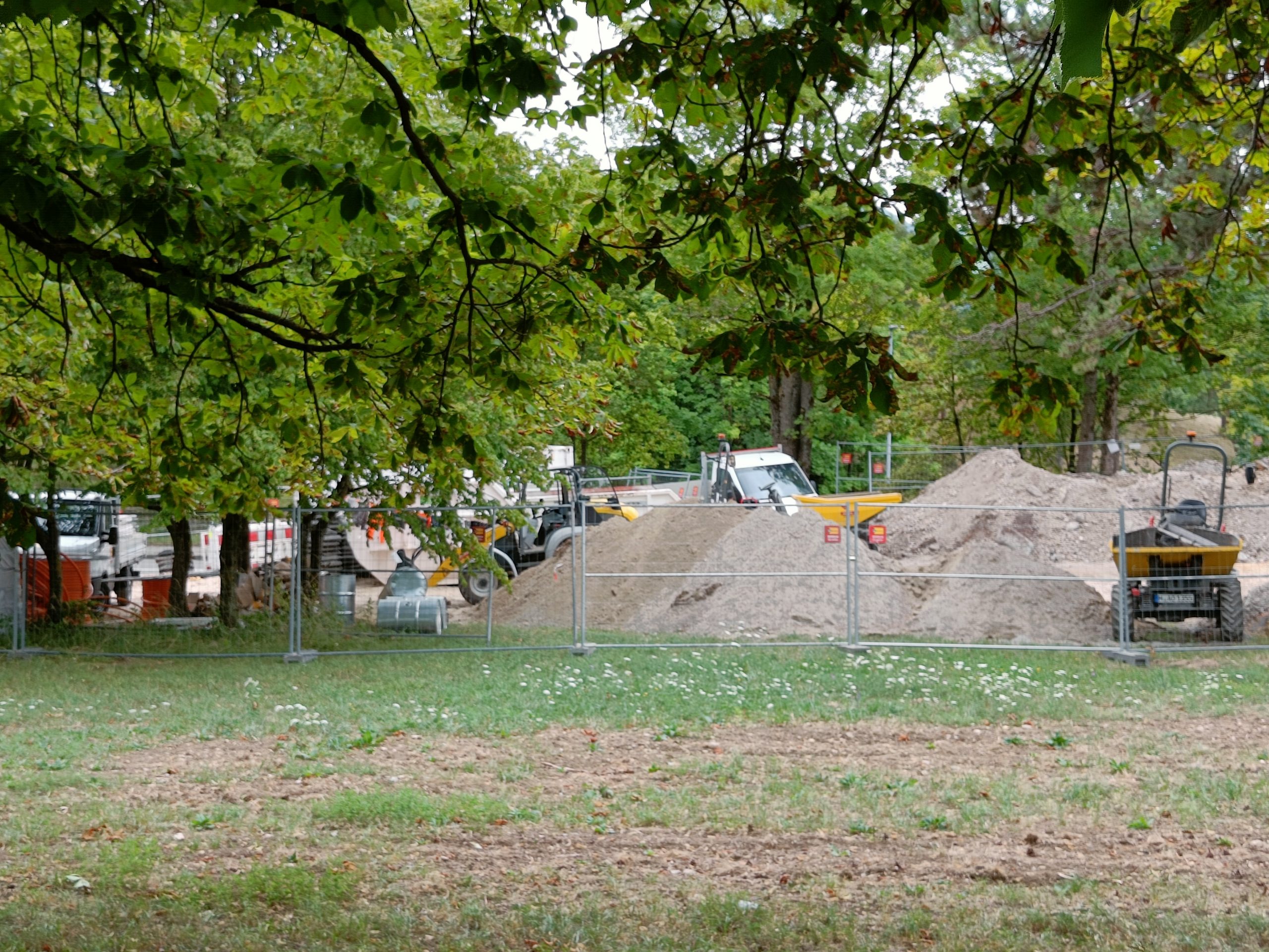 Hier wurde auf einer großen Fläche die Grasnarbe abgetragen, um Fahrzeuge, Material und Schutt abzuladen.